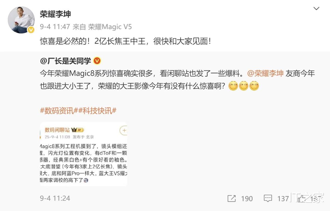 影像系统同样值得期待。荣耀产品线总裁方飞此前微博透露:" 下一代 Magic 系列不止主摄,还将带来 2 亿长焦下的超强蓝调,不同焦段随手能拍,远近都很美。" 旗舰产品经理李坤也回应网友称 "2 亿长焦王中王,很快见面 ",暗示该系列将在长焦领域实现突破。
