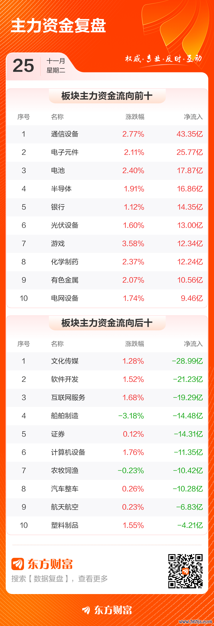 11月25日,沪指涨0.87%,深成指涨1.53%,创业板指涨1.77%。两市成交额1.81万亿,较上个交易日放量844亿。数据显示,今日大盘主力资金净流入112.17亿。通信设备、电子元件、电池等板块主力资金流入排名居前,其中通信设备净流入43.35亿元。