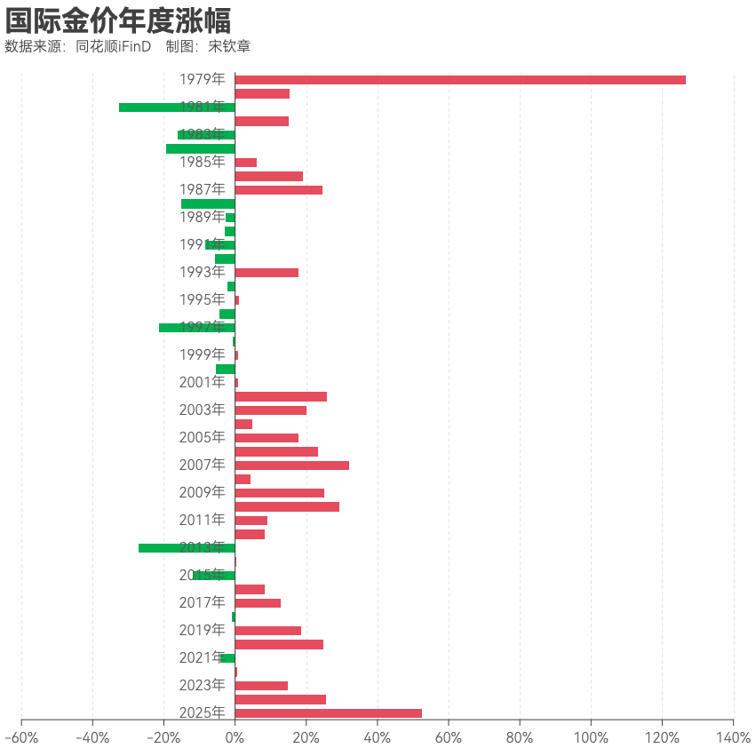 1971年股巢网,布雷顿森林体系瓦解,美元与黄金脱钩,黄金自此回归“独立的避险资产”,开启了价格市场化波动的时代。《每日经济新闻》记者统计1979年以来国际金价年度涨幅数据,一个令人吃惊的现象是,截至发稿,2025年国际金价的年内涨幅已经超过1980年以来的所有年份。