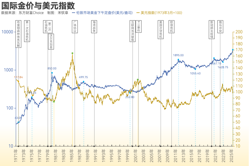 1970年代布雷顿森林体系瓦解以来,黄金价格累计涨幅达到约102倍,但同期美元指数跌幅仅有19%。即便黄金价格涨跌与美元指数波动之间存在着一定的负相关性,但在过去55年间,美元指数以19%的整体跌幅“换取”黄金价格约102倍的涨幅,仍显得“不可思议”。